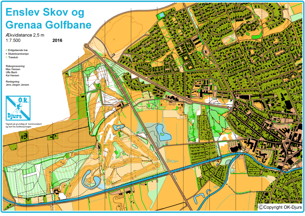 Kort fra2016 over anlægget ved Pavillonen i Grenaa og Golfbanen med Enslev skov.